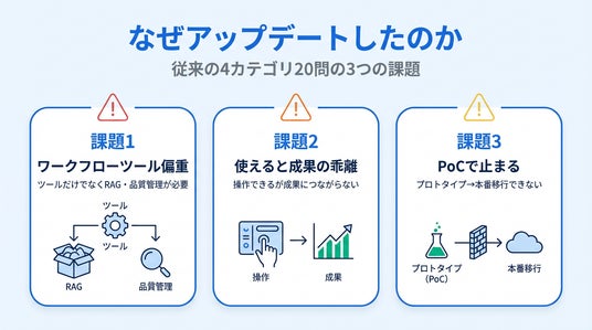 2025年のリリース以来、多くの方にご利用いただいてきた「AI活用診断」。当社ブログ(119記事)の分析と、10ヶ月以上にわたるクライアント企業でのAI研修・推進支援の知見から、従来の4カテゴリ20問では現場で本当に求められるAIスキルを評価できないことが明らかになりました。