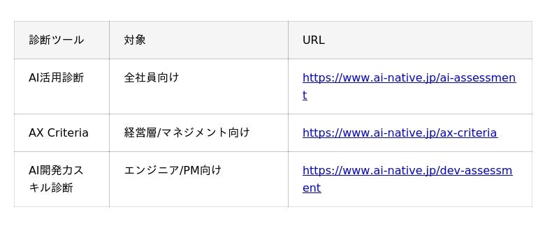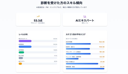 ※ エンジニア・PM等の開発者向けには、より専門的な「AI開発力スキル診断」もご用意しています。実践的な開発スキルを詳細に評価できます。