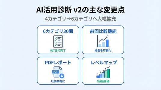 株式会社AI Native(本社:東京都渋谷区、代表取締役:田中 慎)は、個人のAI活用スキルを可視化する無料診断ツール「AI活用診断」をv2に大幅アップデートしたことをお知らせします。従来の4カテゴリ20問から6カテゴリ30問へ拡充し、AI思考・設計力、ナレッジ・RAG・品質管理、PoC→本番化力、組織浸透・推進の4つの新カテゴリを追加。前回診断との比較機能やPDFレポートダウンロードにも対応しました。