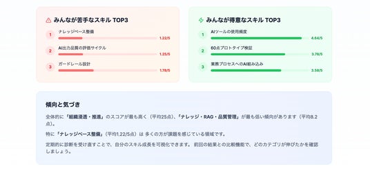 - 苦手スキルTOP3: ナレッジベース整備(平均1.11/5)、AI出力品質の評価サイクル(平均1.14/5)、ガードレール設計(平均1.69/5)