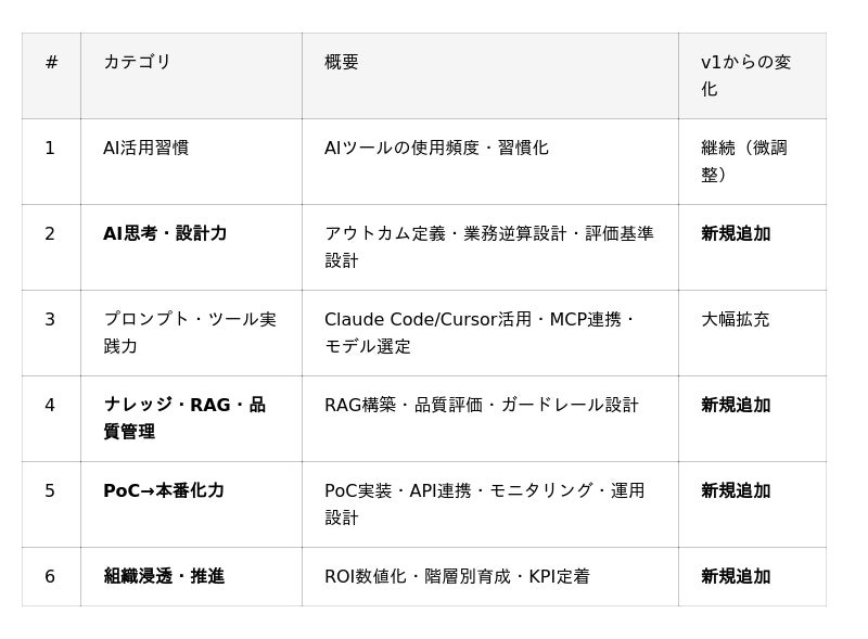 従来の「AIワークフロー実践」カテゴリは、Dify/n8n等のツール経験を問う設計でした。実際にはRAGの構築力、AI出力の品質評価、ガードレール設計といったナレッジ管理・品質管理のスキルが運用、業務成果に直結しており、これらを評価できていませんでした。