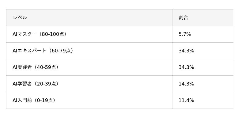 5段階のレベル評価(AIマスター~AI入門前)で、自分の現在地と各レベルで求められるスキル、次に学ぶべきことが一覧で確認できます。