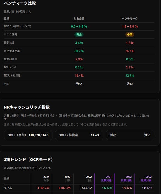 競合他社や同業他社など、利用者自身が選んだ企業の決算書PDFをあわせてアップロードすることで、NRPD、財務指標、NCRI(キャッシュリッチ指標)などを対象企業と並べて比較できます。単独評価では見えにくい相対的な強み・弱みを可視化し、判断の納得感を高めます。