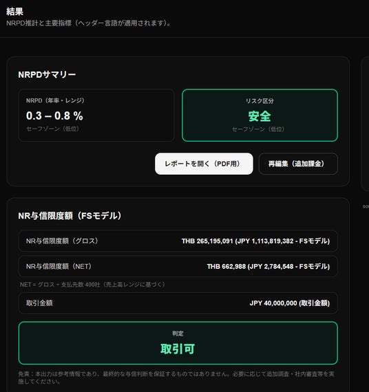 決算書は読める。財務数値も確認できる。それでも、「この取引を進めていいか」という問いに、自信を持って答えられているだろうか。株式会社中村格付研究所(本社:神奈川県川崎市、代表取締役社長:中村裕幸)は、国内外を問わず全世界企業の決算書PDFをもとに、財務分析から与信限度額の算出・取引判定までを一連の流れで支援するWebアプリ「NRPD Web App」を、2026年4月1日に提供開始します。