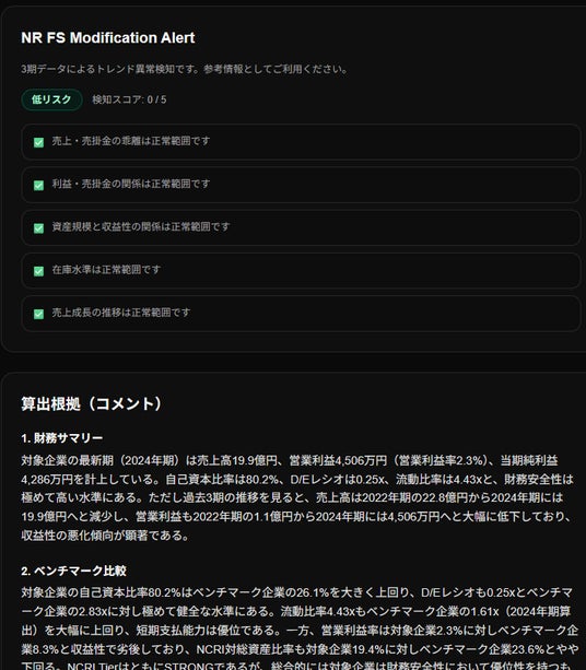 複数期の決算データを比較し、売上と売掛金の乖離・純利益に対する売掛金急増・資産急膨張・在庫比率急増・短期借入金急増など7項目の観点からアラートを表示します。与信判断の前提となる財務数値に違和感がないかをあわせて確認できます。さらに、財務サマリー・ベンチマーク比較・NRPD算出根拠・粉飾リスク解釈・NCRI・与信限度額の根拠・取引判定の7カテゴリーでコメントを整理し、数値の背景と注意点を文章で補足します。結果を鵜呑みにせず、比較と文脈を踏まえて判断しやすい設計としています。