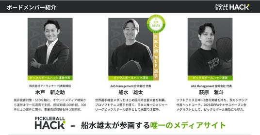 ボードメンバーには、日本人初メジャーリーグピックルボール選手の船水雄太が共同運営として関わっており、ピックルボール業界の発展とピックルボールハックでしか発信できない情報を公開していきます。