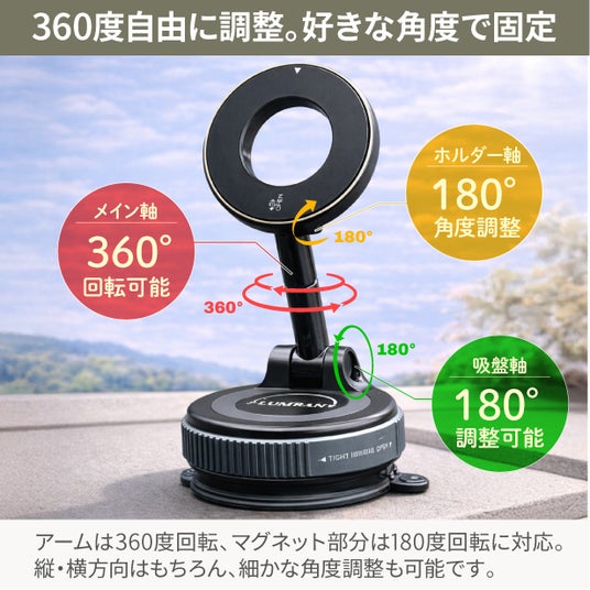 本商品は、ナノジェル×真空吸盤による吸着構造と、マグネットによるワンタッチ固定を特長とする車載スマホホルダーです。