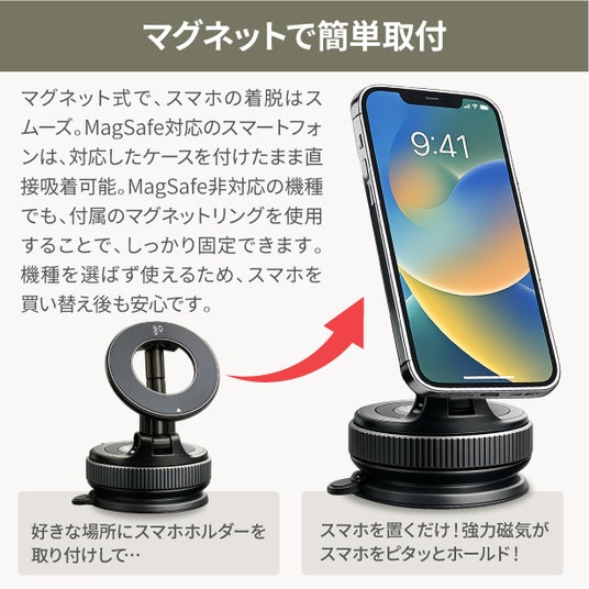 スマートフォンの固定には、マグネットによるワンタッチ固定を採用しています。