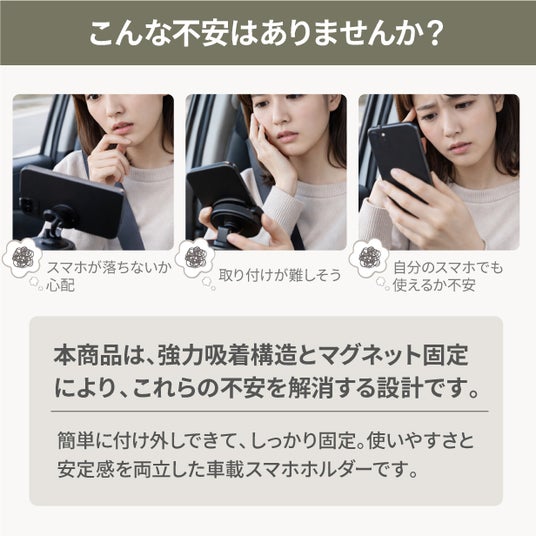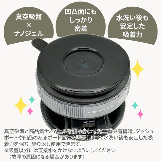 ナノジェル×真空吸盤を採用し、最短1秒固定の新商品。『不安保証』付きで購入後の不安にも対応