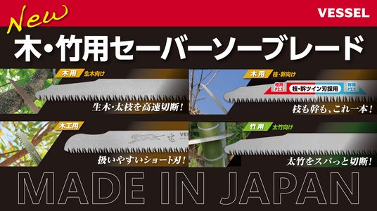 ベッセルは、こうした現場ごとの切断ニーズに応えるため、木用/竹用セーバーソーブレードシリーズのラインアップを拡充しました。今回の追加により、狭所作業に適した木工用ショートモデル、生木・太枝に適した木用生木向け、枝も幹も1本で使い分けしやすい木用枝幹向け、太竹切断に対応する竹用太竹向けがそろい、切る対象や作業シーンに応じて、より選びやすい構成となりました。