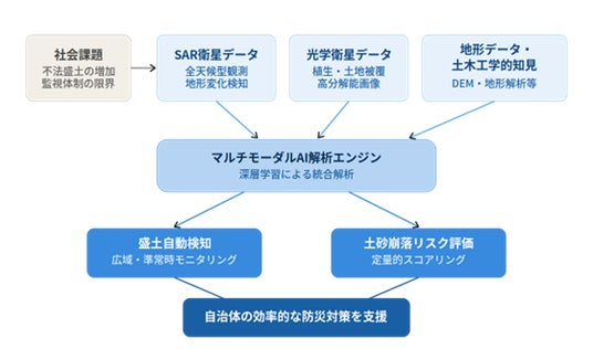 本事業では、複数の衛星データとAI技術を組み合わせ、広域にわたる盛土の自動検知と、検知された盛土の土砂崩落リスクを定量的に評価するシステムを開発します。自治体の調査ニーズに応じた複数の検知モードを備え、天候条件に左右されにくい安定的な監視体制の構築を目指します。