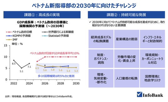 トー・ラム書記長が掲げる平均10%成長目標に対し国際機関予測は5%台に留まり、新指導部は中所得国の罠、インフラ制約、人口高齢化、米中対立など山積する構造課題への対応を迫られる。(出所)現地報道、各国際機関が公表する統計等をもとにInfoBank作成。