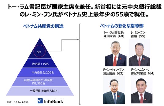 2026年4月、トー・ラム書記長が国家主席を兼任し権力集中が進む。新首相には元中央銀行総裁のレ・ミン・フン氏がベトナム史上最年少の55歳で就任。(出所)InfoBank作成。