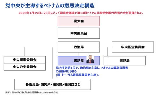 2026年1月の第14回党大会でトー・ラム氏が書記長として続投。前首相・前国家主席は中央委員会から外れ、4月の国会で新首相レ・ミン・フン氏の選出につながった。(出所)現地メディア及び政府公開情報をもとにInfoBank作成。