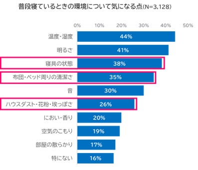- 寝室の睡眠環境:-寝室の睡眠環境で気になる点では、「温度・湿度」「明るさ」などに加えて、「寝具の状態」「布団・ベッド周りの清潔さ」「ハウスダスト・花粉・埃っぽさ」など具体的な清潔・環境要因が相応に挙がった。