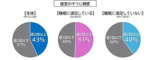 - 睡眠満足度の違いでそうじ頻度にもギャップ。-寝室のそうじ頻度は「週2回以上」が43%。満足度が高い人は、寝室を日頃からそうじをしている人が多い傾向。一方、満足度が低い人は、寝室のそうじ頻度が低いことがわかった。