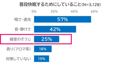 - 快眠対策:実施は多岐にわたる-普段行っている快眠対策は、「暗さ・遮光の調整」57%、「音・静けさ」42%、「寝室のそうじ」25%などさまざま。