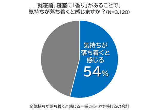 - 就寝前の「香り」がリラックスのきっかけとして広く受け入れられている-また、就寝前、寝室に「香り」があることで気持ちが落ち着くと感じる人が54%と高く、香りがリラックスのきっかけとして意識されている様子がうかがえた。