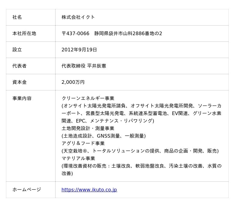 株式会社イクト(本社:静岡県袋井市、代表取締役:平井辰憲、以下 イクト)と、地盤調査・解析・補償サービスなどを展開する地盤ネット株式会社(本社:東京都新宿区、代表取締役社長:石井大樹、以下 地盤ネット)は、再生可能エネルギー(以下 再エネ)の安定供給を目指してソーラーカーポート事業における業務提携契約を2026年4月22日に締結いたしました。
