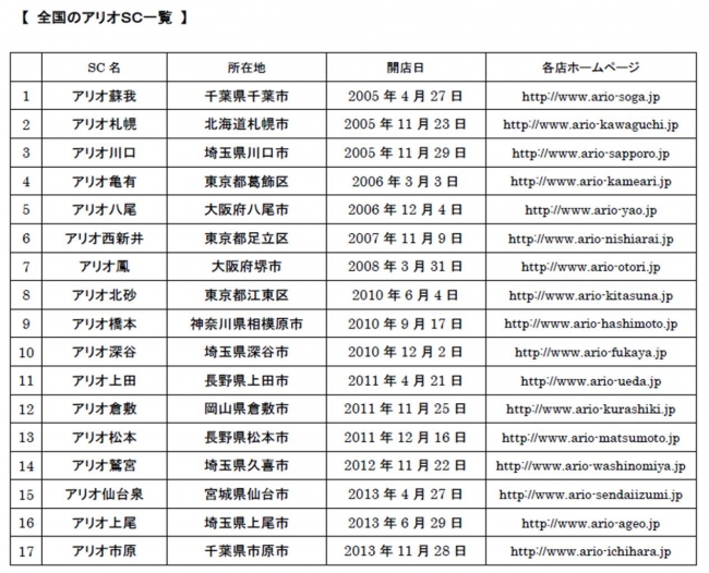 場所 : アリオ17店舗 ※3ページ目のアリオSC一覧をご参照