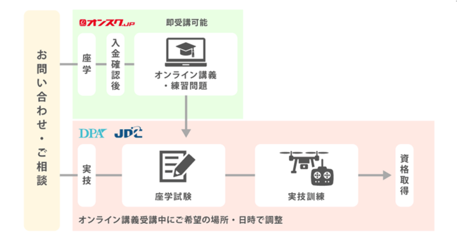 座学はオンラインで、講義動画と問題演習、ダウンロード可能なPDFレジュメ付き。実技での10時間以上の操縦訓練後、初心者でも短時間で「JDCパイロット」もしくは「DPAドローン操縦士回転翼3級」の資格を取得できます。
