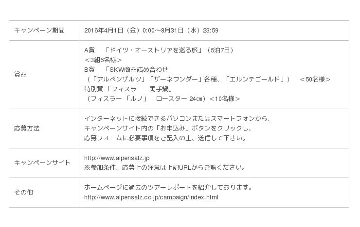 本キャンペーンは、どなたでも応募でき、25,000名以上の応募が集まる毎年恒例の人気のキャンペーンで、今年で12回目を迎えます。本年度は、抽選で「ドイツ・オーストリアを巡る旅」(3組6名様)、「SKW商品詰め合わせ(「アルペンザルツ」「ザーネワンダー」各種、「エルンテゴールド」)」(50名様)をプレゼントします。また昨年に続き、特別賞として、ドイツの高機能キッチンウェアブランド「フィスラー」の「両手鍋(フィスラー 「ルノ」 ロースター 24cm)」を10名様にプレゼントします。