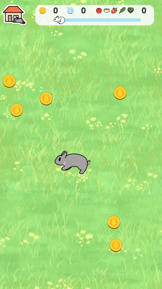 タップ操作で楽しめるミニゲーム「おさんぽ」では、うさぎさんを操作してアプリ内アイテムを購入するのに必要な「コイン」や、うさぎさんに与えることができる「おやつ」を集めることができます。