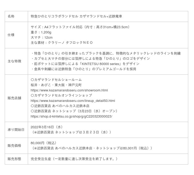 1950年創業の老舗ランドセルメーカー、有限会社カザマ(本社:奈良県桜井市 創業者:風間春雄)は、近畿日本鉄道が大阪難波駅~近鉄名古屋駅間などを運行する特急「ひのとり」をモチーフにしたランドセル、「特急ひのとりコラボランドセル カザマランドセル×近鉄電車」を完全受注生産で、2022年3月16日(水)から、カザマランドセルのショールーム、とオンラインショップ、近鉄百貨店あべのハルカス近鉄本店にて、2022年3月23日(水)から近鉄百貨店ネットショップにて販売します。