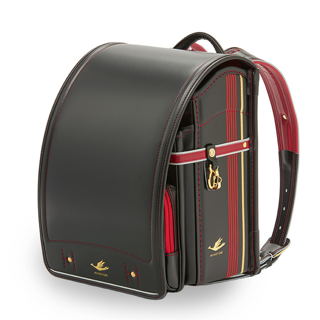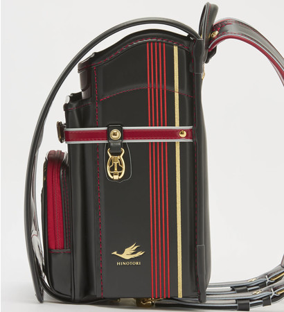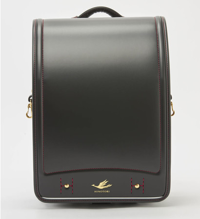 「特急ひのとりコラボランドセル カザマランドセル×近鉄電車」は、特急「ひのとり」の引き締まったブラックを基調に、特徴的なメタリックレッドのラインの刺繍を施したデザイン。