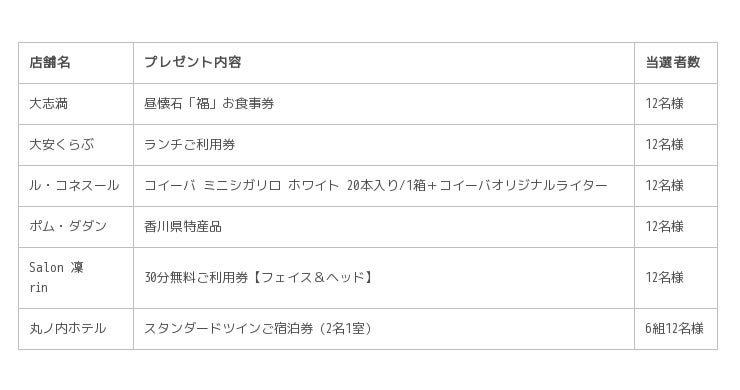 また、ホテル館内の加賀料理「大志満 丸ノ内 椿壽」、鉄板焼「大安くらぶ」、シガーバー「ル・コネスール」の3店舗においても、上記期間中初めて開業記念商品を提供するほか、特別宿泊プランや、「リフレクソロジーサロン」の特別コースなどを用意します。また、開業12周年記念特別商品を利用いただいたお客様には、ホテル館内の利用券が当たる抽選イベントを実施します。