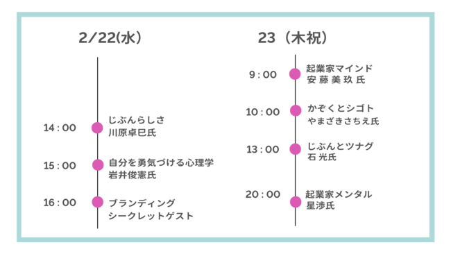 様々なゲストをお招きし、自分らしさや思考、マインド、などのテーマでお話しいただき、参加者のみなさまに自分自身の起業を見返していただきたいと考えております。