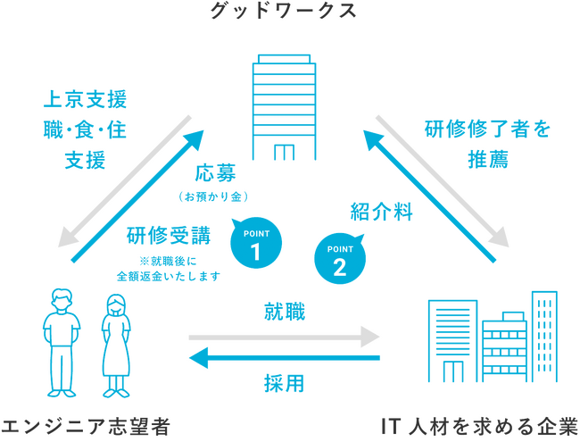 また「ぼくらのあした」では、運営する上京支援型プログラミングスクールでの1~2ヶ月の職業訓練後、当社経由で就職先が決定した際に、サービス開始時の研修受講料(お預かり金)を全額キャッシュバックする仕組みを採用しているため、実質無料でサービスを受けることが可能です。