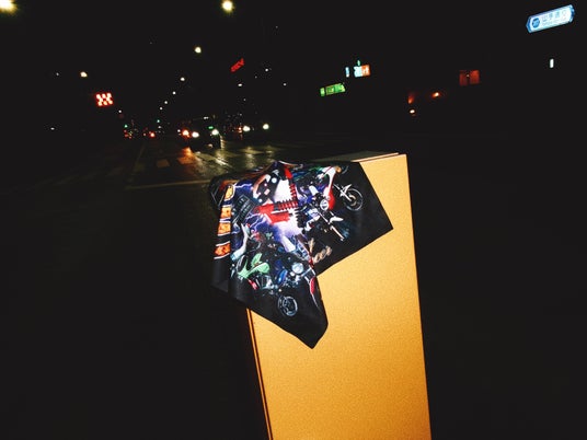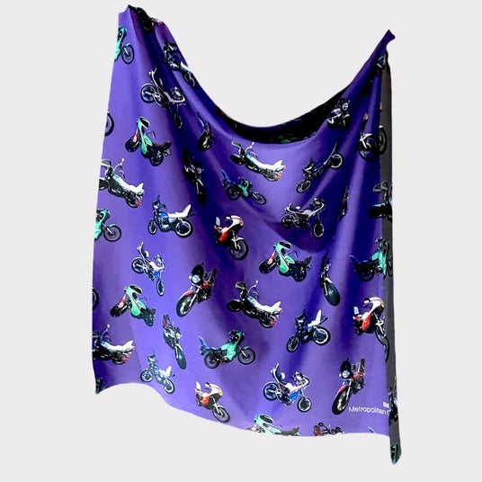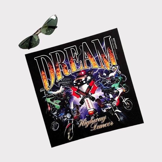 55cmx55cmは「族車パラダイス」と題したこのクロスは、その名の通り、当時の誰もが憧れた族車が55cm両面にランダムに並んでいる。この紫とグレーの配色がカッコよくどちらの面もファッションにとても取り入れやすいデザインとなっている。このクロスを持っているだけで、間違いなく会話が弾むのが目に浮かぶ。55cmはバンダナサイズとなっているので、バイクに乗るときのマスク代わりにもなるだろうし、バンダナとして腰にぶら下げたり、ドゥーラグとしての使い方もおすすめだ。そして、バイクのヘルメットやボディを磨くクロスとしての使い方もかっこいい!重宝しそうだ。
