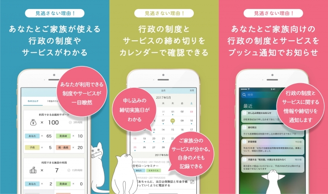 利用に申し込み期限がある行政の制度、サービスの締切や、行政の制度、サービスの利用についての情報をスマートフォンのプッシュ通知機能からお知らせするので、申し込み忘れの防止になり、あなたが利用できる行政の制度、サービスを取り逃しません。