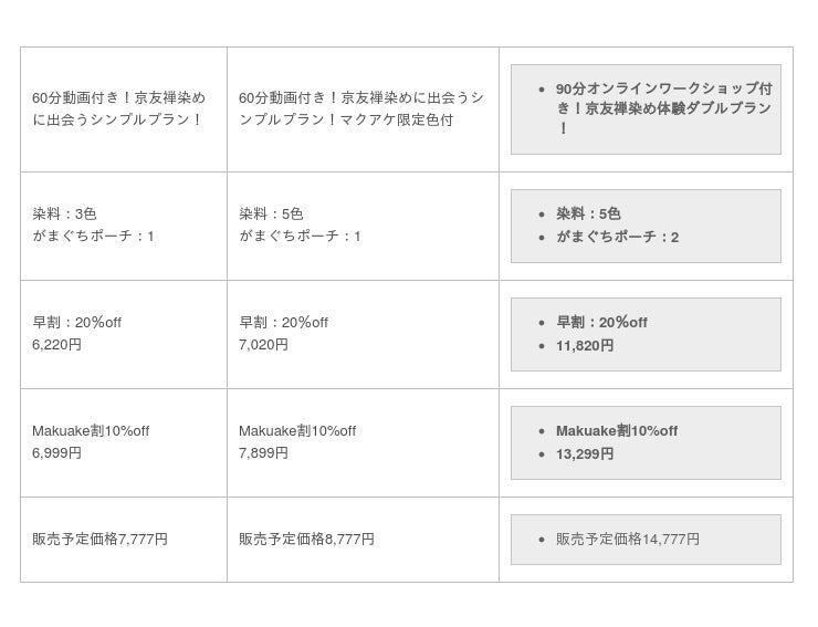 染料が3本入った基本色セットのほか、Makuake限定色入りの5本セット、オンラインワークショップのついたプランの3つのプランをご用意いたしました。