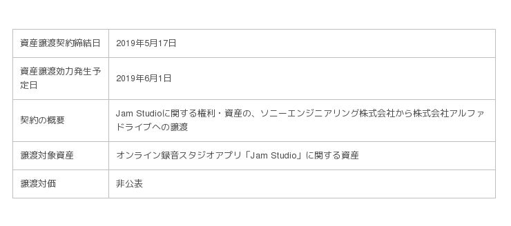 今回、Jam Studioの事業主体をソニーエンジニアリングからアルファドライブへと移管することで、Jam Studioのさらなる育成と、柔軟な資本・投資戦略の立案を可能にするという狙いから、資産譲渡契約を締結いたしました。ソニーエンジニアリング社内でJam Studioを運営していた企画・開発チームは、資産移管後にアルファドライブへと引き継がれ、Jam Studioをご利用いただいているユーザーのみなさまにこれまで以上の価値提供・サービスレベルの向上を目指してまいります。
