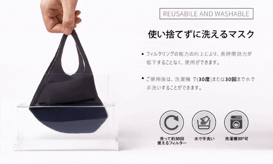 ACTIVE MASKはフィルタリングを止めることはなく、長時間使用して洗濯機で30度または30回まで手で水洗いができます。