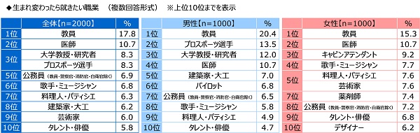 生まれ変わったら就きたい職業 1位「教員」2位「医師」3位「大学教授・研究者」「プロスポーツ選手」
