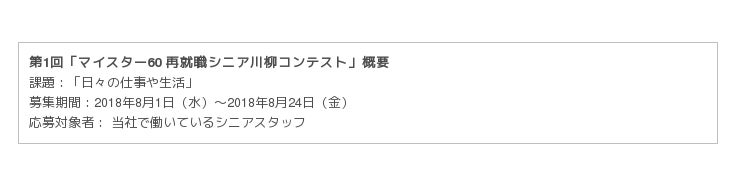 高齢者の就労支援を行う株式会社マイスター60(本社:東京都港区、社長:小倉 勝彦)は、9月17日の敬老の日に向け川柳コンテストを2018年8月1日より開催し、受賞作品計5句を選定いたしました。