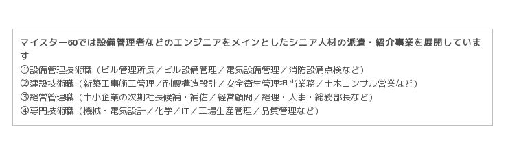 当社は、長年実績を積み重ねてきた建設・設備管理をはじめとする技術部門の人材のみならず、事務部門の人材の雇用創出に注力、また高齢者の就労意識の向上にも向き合っていきたいと思っています。中高年の意識改革のための「シニアワークコンサルプログラム」、増加する訪日外国人のアテンド要員としての「おもてなしシニア隊(R)」の創設などはその一端であります。