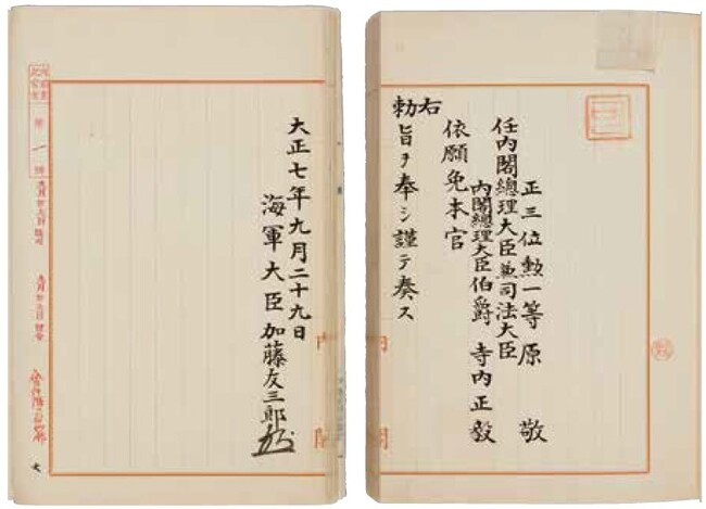 【任内閣総理大臣兼司法大臣 原敬・依願免本官 内閣総理大臣 伯爵寺内正毅】