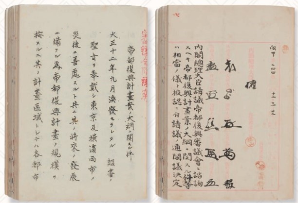 大正12年(1923)9月1日に発生した関東大震災は、死者約10万名、行方不明者約4万3千名、全壊家屋は約12万8千戸、焼失家屋は約44万7千戸という甚大な被害をもたらしました。9月2日に非常徴発令、臨時震災救護事務局官制、戒厳令が発せられたほか、私法上の金銭債務の支払延期(モラトリアム)を認める緊急勅令などにより、人びとの生活を支える対応が取られました。生活復旧の実施と並行して東京・横浜の復興計画の具体化も進められ、9月27日に設置された帝都復興院は、復興計画案をまとめ、帝都復興審議会に諮詢されます。