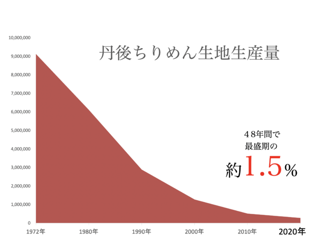 2010年からKUSKAブランドを立ち上げ手織りネクタイを中心に国内は帝国ホテルプラザ東京1Fに旗艦店・海外はロンドン・サヴィルロウのロイヤルワラントの店舗を中心に5カ国で展開をしていますが、地元丹後の織物産地の衰退は1972年頃から右肩下がりの大衰退(全盛期の1.5%の生産量)が続いています。