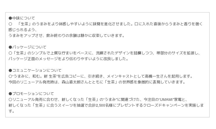 「生茶」は、今後も新しい緑茶カルチャーの確立を目指し、お茶の魅力を発信し続けることで緑茶市場の活性化に貢献していきます。