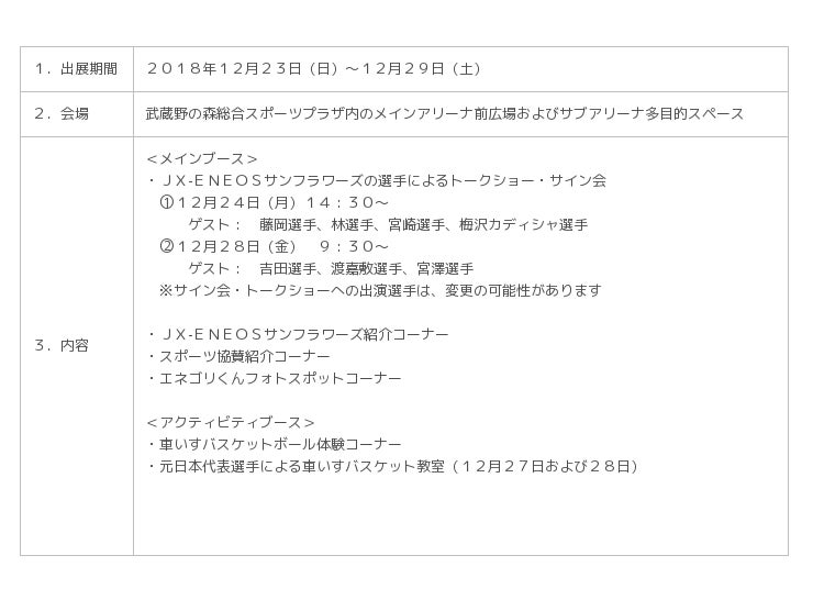 また、当社は大会期間中、会場にイベントブースを設置し、JX-ENEOSサンフラワーズの選手によるトークショーや元日本代表選手による車いすバスケット教室などを開催する予定です。観戦の際に、ぜひお立ち寄りください。