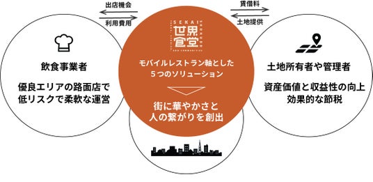 モバイルレストランを軸とした5つのソリューションで、飲食事業者/街と生活者/土地所有者に革新的なメリットをもたらします。