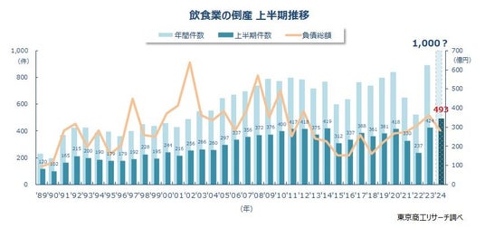 飲食業の倒産が増勢を強めている。2024年上半期(1-6月)の飲食業倒産(負債1,000万円以上)は493件(前年同期比16.2%増、前年同期424件)で、2年連続で過去最多を更新した。現在のペースで推移すると、年間では初めて1,000件超えとなる可能性が出てきている。