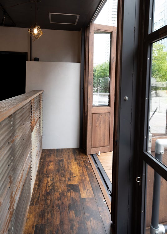 モバイルレストラン(型式:世界食堂20FT):設置と撤収が最短2時間でできる。キッチンカーと異なり、本格的な調理や店内飲食ができるほぼ完全な飲食店