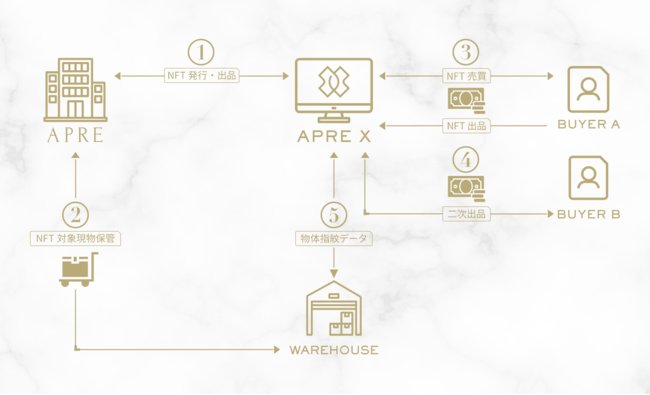 2. 現物商品はアプレ社が倉庫に保管し、商品の所有権のみを NFT として販売。商品の輸送コストとリスク(破損、紛失、偽物へのすり替え etc)を減少