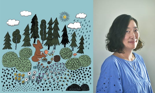 彼女が絵と訳を手がけた初の絵本『しずかなところはどこにある?』(岩波書店)に登場するキャラクターたちが、森の中で穏やかなピクニックを楽しむ一場面が描かれています。